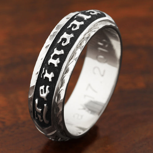 14K White Gold/Sterling Silver Custom-Made Plumeria Scroll Double Raise Letter Diamond Cut Edge Ring (Thickness 2.5mm)