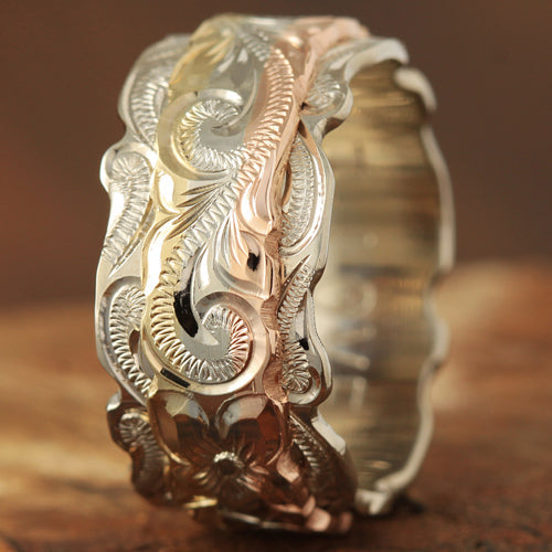 14K Tri-Color Gold Custom-Made Hawaiian Scroll Engraving Double Cut Out Edge Ring
