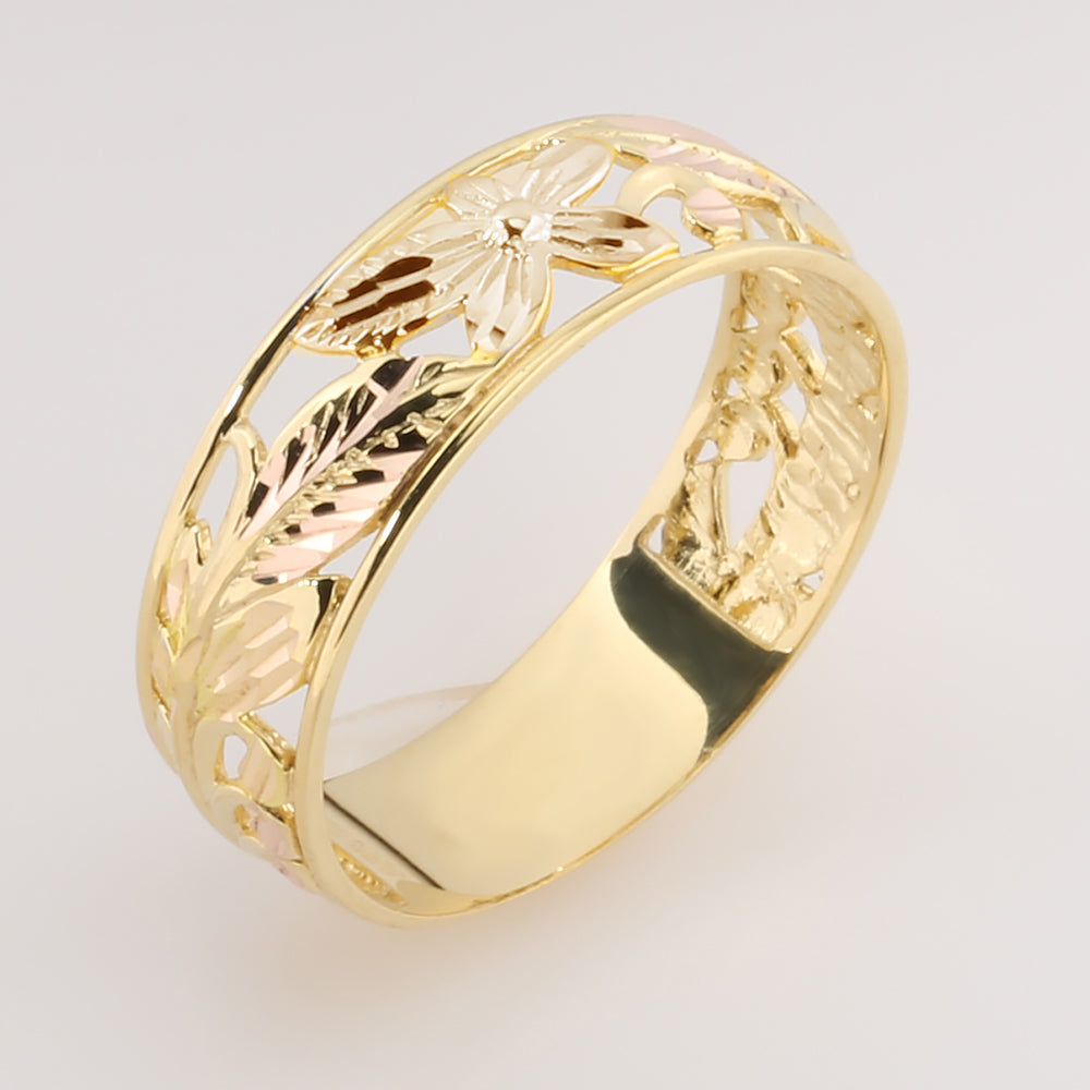 14K Tri-Color Gold Plumeria Lei Ring Sandblast Polish Edge 5mm