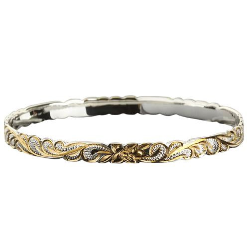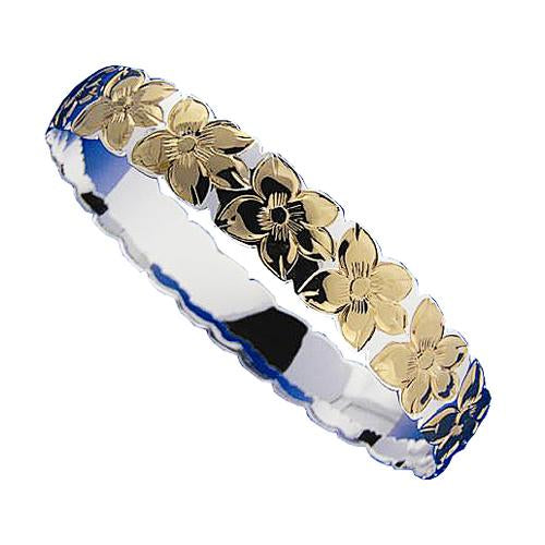 Sterling Silver Hawaiian Jewelry Plumeria Engraved Bangle Two Tone Yellow Gold