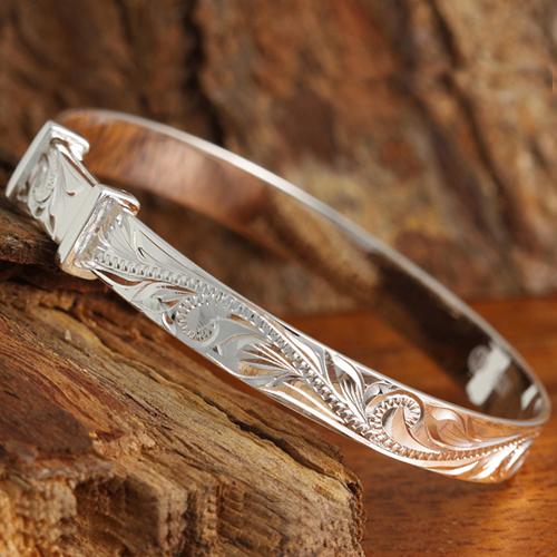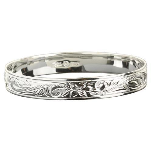 Sterling Silver Hawaiian Bangle Scroll Plumeria Engraving Straight Edge