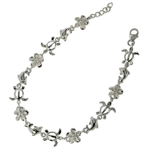 Sterling Silver Rhodium Plated Honu (Turtle) Dolphin and 8mm Plumeria with CZ Bracelet
