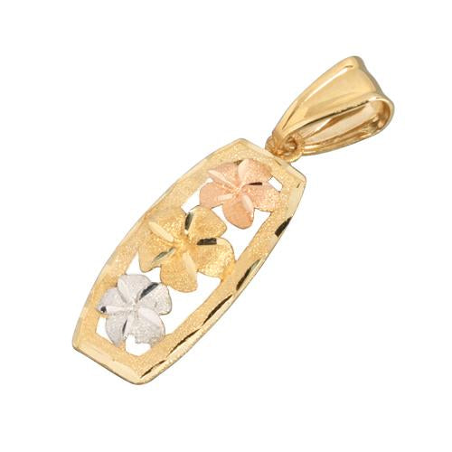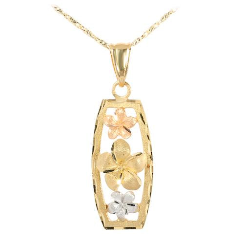 14K Tri-Color Gold Three Plumeria Vertical Pendant (S/L) (Chain Sold Separately)