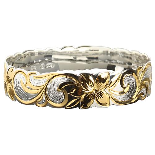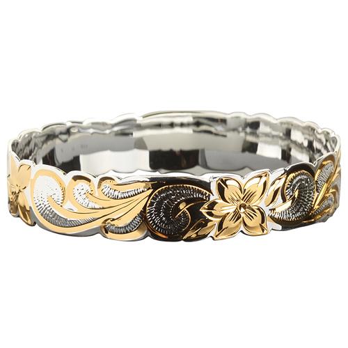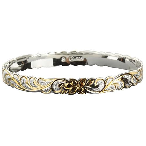 Hawaiian Sterling Silver Bangle Queen Scroll Engraving Cut Out Edge Yellow Gold Two Tone